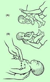 Se desaconseja esta maniobra. En casos de ahogamiento se procederá sujetando al niño boca abajo e inclinado ligeramente hacia delante. Se debe sujetar la cabeza con el antebrazo y después propinarle varios golpes (con una fuerza proporcional al desarrollo del niño) entre los omóplatos o paletillas. Si a la sexta maniobra no respira se le dará la vuelta, se le apoyará sobre una superficie rígida y se presionará varias veces en el centro del tórax.